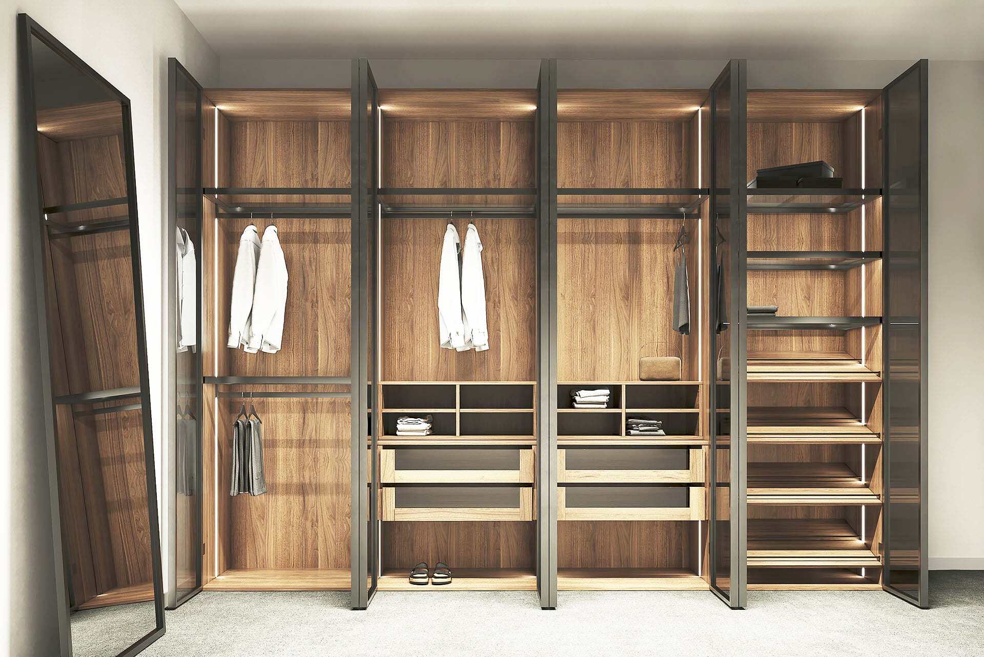 - Фасад гардеробной (если выбран не открытый вариант хранения) может быть выполнен из самого разнообразного плитного материала: шпонированной, ламинированной или облицованной различными видами пластика ДСП, крашеного МДФ, а также стекла и металла. Заказчику также предлагаются на выбор большое количество ручек различной конструкции и дизайна.